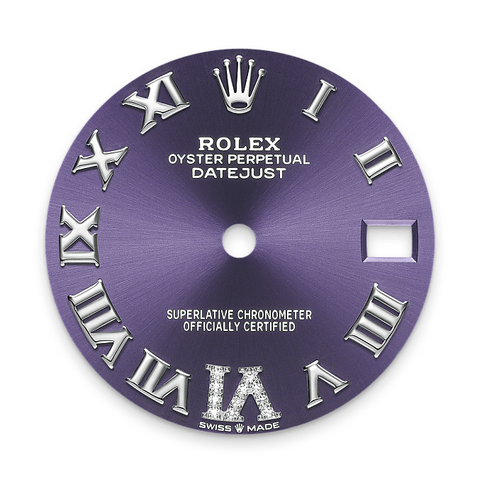 Esta esfera presenta un gran VI engastado de 11 diamantes. El acabado tipo sol crea delicados reflejos de luz en muchas esferas de la colección Oyster Perpetual. Se obtiene utilizando técnicas magistrales de cepillado que crean surcos que salen del centro de la esfera. La luz se difunde constantemente a lo largo de cada grabado, creando un sutil brillo característico que se mueve según la posición de la muñeca. Una vez completado el acabado tipo sol, el color de la esfera se aplica mediante PVD (Physical Vapour Deposition) o galvanoplastia. Una ligera capa de barniz le da a la esfera su aspecto final.