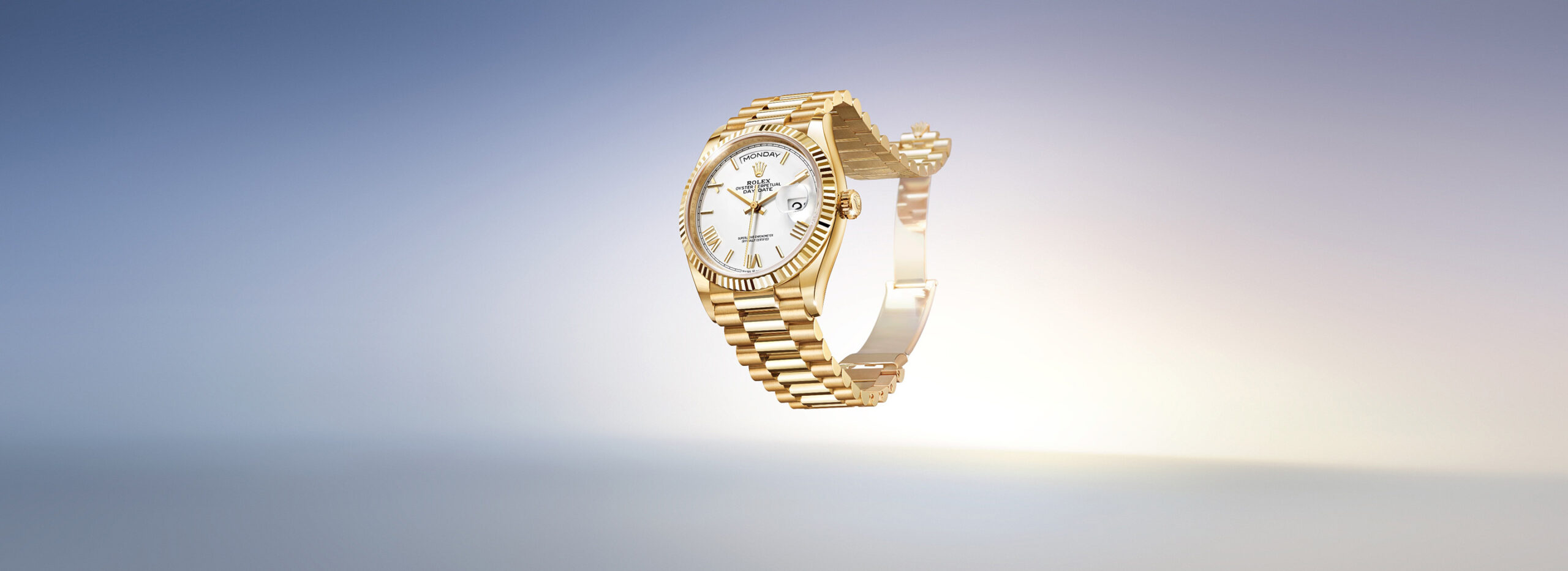 El DayDate 40 y el DayDate 36 están dotados de un brazalete President. Creado especialmente para el lanzamiento del prestigioso Oyster Perpetual DayDate en 1956, este brazalete de tres elementos, fabricado exclusivamente en oro de 18 quilates o en platino 950, todavía hoy se reserva al DayDate, así como al Datejust en metal precioso. Está dotado de un elegante cierre Crownclasp desplegable invisible e incorpora, en el interior de sus eslabones, inserciones de cerámica —diseñadas por Rolex y patentadas— para aumentar su fluidez de uso y su longevidad.