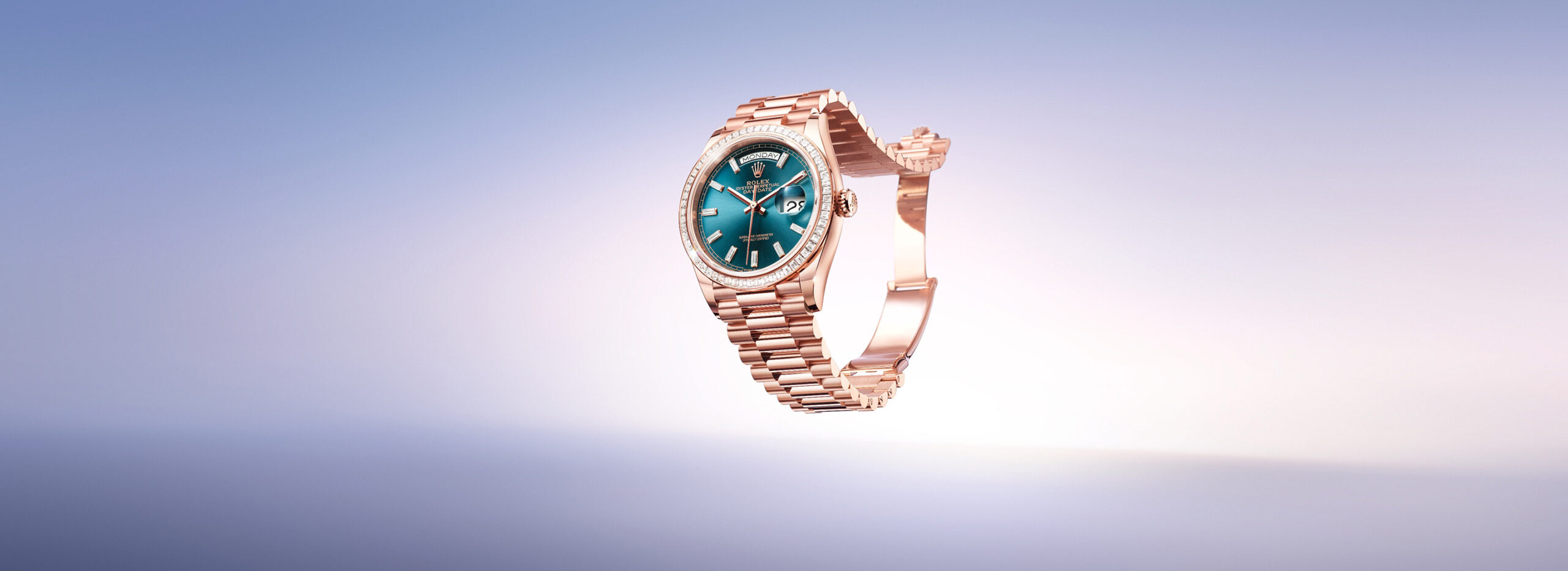 El DayDate 36 en oro Everose de 18 quilates presenta por primera vez una esfera azul-verde adornada con diez diamantes talla baguette. Esta esfera, que se distingue por su profundidad e intensidad, también se encuentra disponible en una modalidad dotada de un bisel engastado con 60 diamantes talla trapecio. La fabricación de este bisel, reservado hasta ahora para el DayDate 36 en platino 950 y para el DayDate 40 en oro de 18 quilates o en platino 950, requiere tiempo y paciencia por parte del engastador, que ajusta y fija a mano cada una de las gemas.