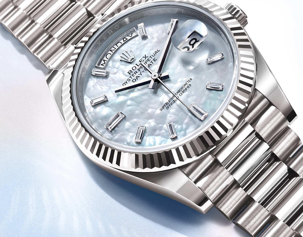 La gama Day-Date se enriquece con nuevas variaciones interpretadas con arreglo a una partitura que se domina desde hace tiempo: un savoir-faire excepcional y complejo que se refleja hasta en el más mínimo detalle. Colores, materiales, motivos decorativos y marcadores de horas; todos y cada uno de estos elementos aportan armonía a unas combinaciones inéditas.